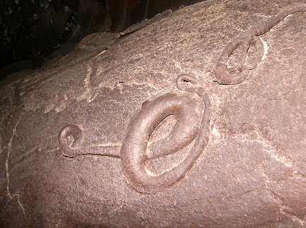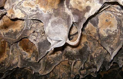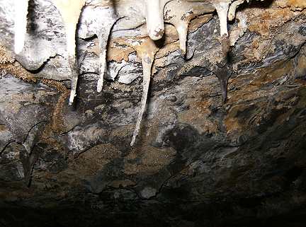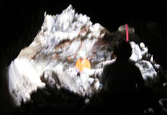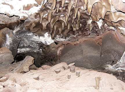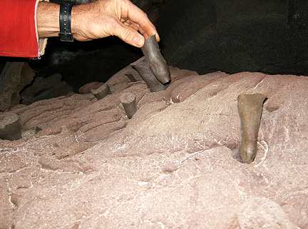 A sequence of photos showing what was a floating slab of semi-molten lava which was lifted to the ceiling. Stalactites where impailed on the soft rock and broken off. The slab receded with the lava flow and left peices sitting loose like so many chess pieces!